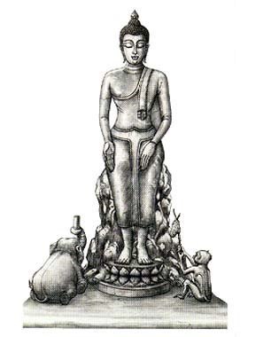 ลักษณะพระพุทธรูป : พระพุทธรูปอยู่ในพระอริยาบถประทับ (นั่ง) บนก้อนศิลา พระบาททั้งสองวางบนดอกบัว พระหัตถ์ซ้ายวางคว่ำบนพระขนุ (เข่า) พระหัตถ์ขวาวางหงาย นิยมสร้างช้างหมอบใช้งวงจับกระบอกน้ำ อีกด้านหนึ่งมีลิงถือรวงผึ้งถวาย