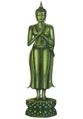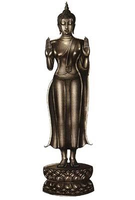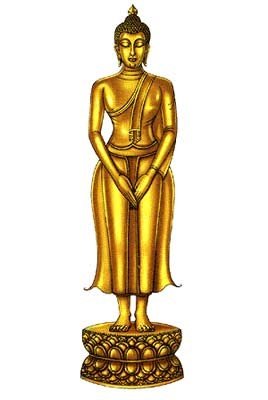 ลักษณะพระพุทธรูป : พระพุทธรูปอยู่ในพระอริยาบถยืน พระหัตถ์ทั้งสองประสานกันยกขึ้นประทับที่พระอุระ (อก) พระหัตถืขวาทับพระหัตถ์ซ้าย